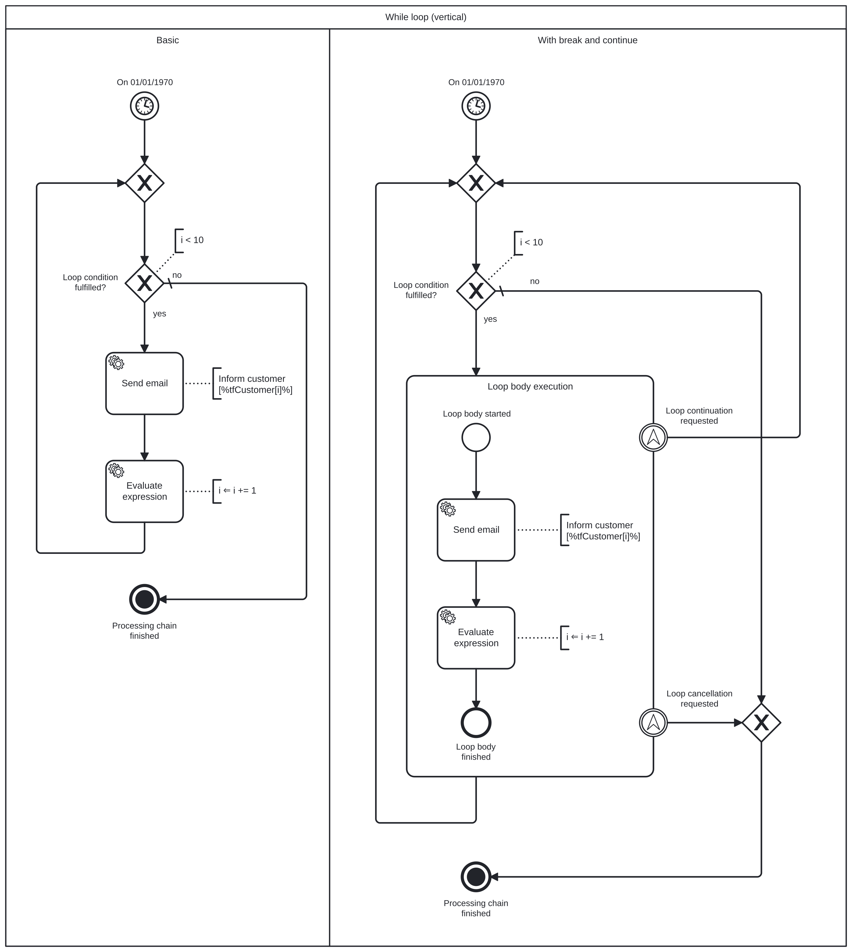 BPMN modelerfornodesthat execute like a pre-test loop, e.g. a while loop. Creates adivergingandconvergingexclusive gateway, and places the loop body between the gateways. When the loop condition matches, redirects thesequence flowto the loop body. If it does not match, redirects it to the end of the loop.If the loop body contains nodes that can